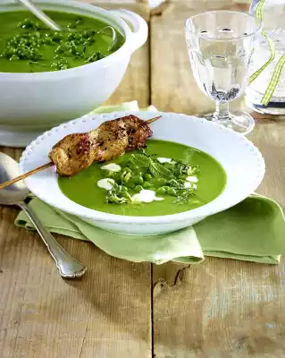 Fill soup into bowls. Spread 4 tablespoons of peas on top. Add a teaspoon to each soup with remaining crème fraîche, garnish with mint and serve immediately with chicken skewers.