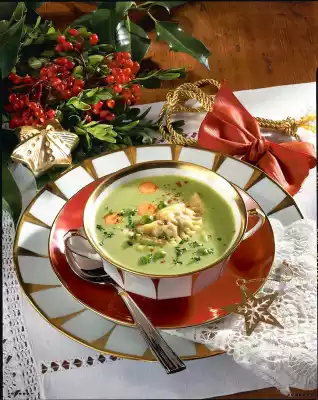 Put some chopped filling in the middle of each circle. Fold over the circles and press firmly with a fork. Cook in boiling salt water for about 10 minutes. For the soup, drain the peas and puree them in the stock. Whisk 2 tablespoons of cream and the remaining egg yolk. Add the rest of the cream to the soup, bring to the boil. Add whisked egg yolk to the soup and bring to the boil. Do not let it boil afterwards. Warm up the dumplings in it. Season soup with salt and pepper. Serve garnished with chopped parsley and steamed carrot slices as desired