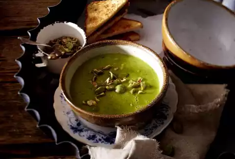 Roughly chop the wasabi nuts. Wash the mint, shake dry and pluck off the leaves. Add mint to the soup and puree everything. Season to taste with salt and pepper. Arrange the soup in deep bowls and sprinkle with wasabi nuts.