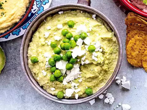 Cover the frozen peas in a bowl with boiling water and let them steep for about 3 minutes. In the meantime clean, wash and chop the spring onions. Drain the peas. Crumble the feta roughly. Puree peas and feta, up to about 1 tbsp each for the topping, with spring onions, lemon juice and 2 tbsp olive oil using a hand blender. Mix in 2-4 tablespoons of water until the desired consistency is achieved. Sprinkle with pea feta topping.