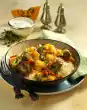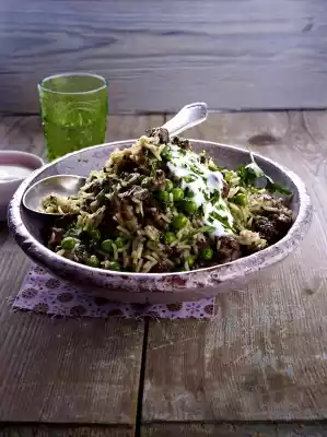 Meanwhile, wash the parsley, shake dry and chop finely, except for one leaf for garnishing. Add peas after the end of cooking time, bring to the boil briefly. Add the parsley. Arrange pea and lamb rice in a bowl garnished with parsley leaves. Serve with a dash of yoghurt