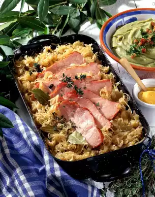 Peel and chop the onion. Wash and dry the Kasseler. Heat the fat in a casserole dish. Brown the onions in it. Fry the smoked pork on all sides. Add sauerkraut and apple juice.