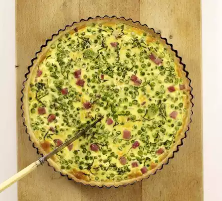Put flour, some salt, butter in pieces and 1 egg into a bowl and knead first with the dough hooks of the hand mixer, then with your hands to a smooth dough. Wrap dough in cling film and chill for about 30 minutes. Blanch peas in salt water for approx. 2 minutes, then rinse under cold water. Cut ham into small cubes. Wash mint, dab dry and cut into thin strips. Heat oil in a pan and fry the ham cubes for 1-2 minutes, then place on a piece of kitchen paper. Whisk 4 eggs and whipped cream and season with salt, pepper and nutmeg.