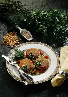 Stir in the quark and egg yolk and knead everything well. Form 12 roasts from the mixture. Heat 3 tablespoons of oil and fry the roastings on each side for about 3 minutes. For the marinade, wash the herbs, put something aside for garnishing, chop the rest finely.