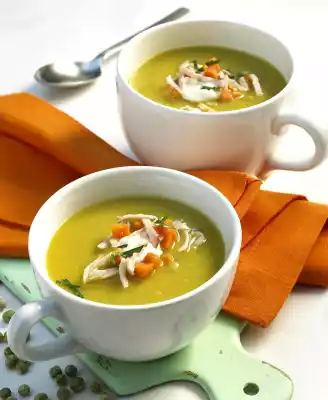 After about 1 hour add the whole carrot and cook it. As soon as the peas are soft and crumble, remove the whole carrot from the soup and cut into small cubes. Add horseradish to the soup and puree it with a hand blender. Cut the turkey breast into thin strips. Wash the parsley, dab dry and cut the leaves into strips. Bring the soup to the boil, season with salt and pepper and fill into 4 bowls. Put 1 teaspoon of crème légère on each soup and decorate with carrot cubes, turkey strips and parsley