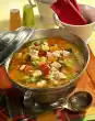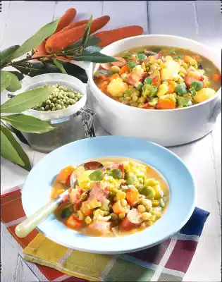 Clean, wash and cut leek into rings. Add vegetables to the soup after about 30 minutes. Lift the smoked pork loin out of the soup and cut the meat into cubes. Cut kielbasa into slices and heat both in the soup. Season to taste with salt and pepper. Serve sprinkled with fresh herbs