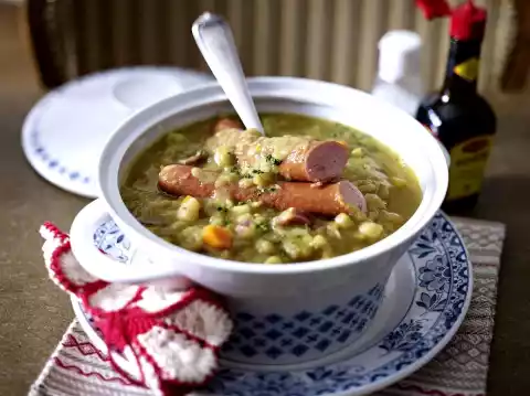 Rinse off the ham bones. Place in a large pot with bacon, onions, soup vegetables, peas, peppercorns and bay leaf. Add 3 l water, bring to the boil, cover and simmer for about 3 hours until the peas are slightly overcooked.