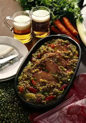 Add the soup greens, cured pork and krakauer to the peas 30 minutes before the end of the cooking time. Remove the sausages and meat. Cut the sausage into slices. Season stew with salt and pepper. Put stew with meat and sausage slices in an ovenproof dish.