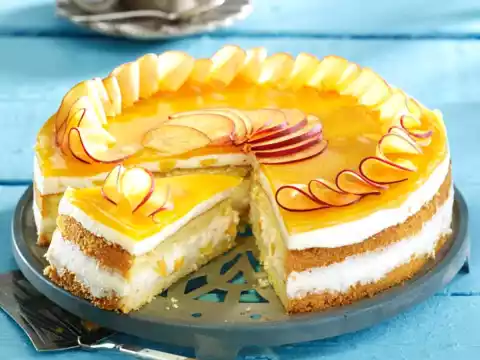 Stir in 3 tablespoons of yoghurt cream, then stir into the remaining yoghurt mass. Chill until it begins to gel. Whip the cream until stiff. First add peach cubes, then cream to the yoghurt mass. Cut the sponge cake in half horizontally. Cover the bottom cake base with a cake ring. Spread 2/3 of the yoghurt cream on the base, place the second base on top. Spread the rest of the cream on the sponge cake and smooth it down. Chill for 2 hours. Mix the cake glaze with 3 tablespoons of sugar in a small pot. Gradually stir with peach nectar until smooth. Heat while stirring, bring to the boil briefly and let rest for 1 minute. Spoon onto the cake and chill. Decorate with peach slices