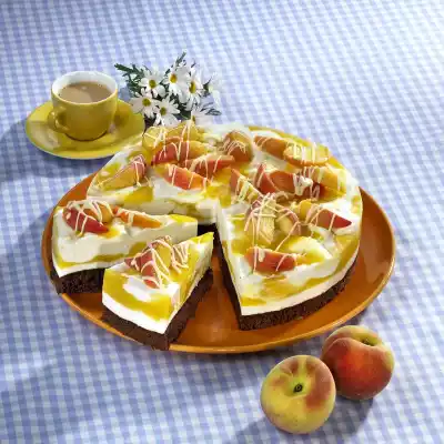 White and yellow cream marble-like with a fork. Chill the cake for at least 5 hours, preferably overnight. Coarsely chop the chocolate coating and melt it in a warm water bath. Peel the skin from the remaining peaches as described. Cut the peaches into slices and spread with lemon juice. Remove the cake from the cake ring and cover with peaches. Put the chocolate coating in a piping bag, cut off a small corner and cover the cake with fine strips. Keep cold until serving
