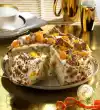 Add beaten egg whites and fold in evenly. Form a 5 cm high rim around two soufflé tins (approx. 9 cm Ø, 150 ml content) each with double layered baking paper and tie them together. Pour in the mixture and freeze in the freezer for about 4 hours. Remove baking paper and smooth the parfait edge with a knife. Cut the remaining peach wedges twice and place them on the parfait. Sprinkle with pistachios and serve decorated with lemon balm as desired
