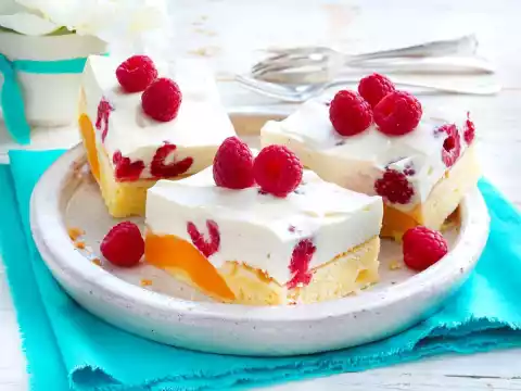Whip cream until stiff and fold in. Carefully fold in 175 g raspberries and spread evenly on the cake. Put the cake in a cool place for 4-5 hours. Cut cake into 24 pieces and decorate with 125 g raspberries