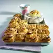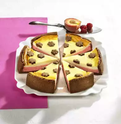 Spread the raspberry mixture on the shortcrust pastry base and smooth it down. Pour the peach mixture on top and carefully smooth it down. Spread the shortcrust pastry blossoms evenly on the surface and press down gently. Bake in a preheated oven (electric cooker: 175 °C/ convection oven: not suitable/ gas: level 2) for approx. 1 hour. Cover the cake if necessary after 3/4 of the time. Remove the cake from the oven. Loosen the edge of the springform pan and let it cool down for about 2 hours