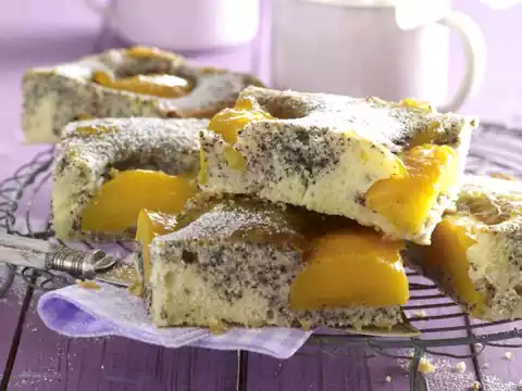 Place the peaches on the dough with the cut surface facing down. Bake in the preheated oven (electric cooker: 175 °C/ convection oven: 150 °C/ gas: level 2) for 35-45 minutes. Warm up the jam. 10 minutes before the end of the baking time, brush the cake with the jam. Leave to cool on a cake rack. Dust with icing sugar.