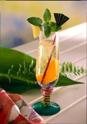 Put peach slices in a glass. Pour liqueur and lime juice over it. Top up with well chilled sparkling wine. Garnish with mint.