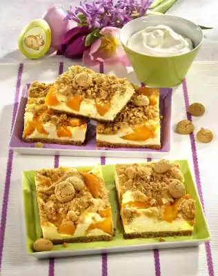 Beat the egg white with a pinch of salt until stiff, fold into the quark mixture. Pour the quark mixture onto the base. Spread the remaining crumbles and peach slices on top. Bake in the preheated oven (electric cooker: 175 °C/ convection oven: 150 °C/ gas: level 2) for approx. 45 minutes. Remove from the oven and let cool on the tray. Heat up the apricot jam and spread on the peach slices. Coarsely crumble 2 tablespoons of Amarettini. Decorate the cake with the whole and crumbled Amarettini