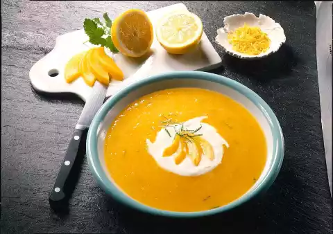 Puree the peaches in the juice, except for one half. Stir in peach nectar and divide into 4 deep plates. Wash the lemon thoroughly, dab dry and grate the peel. Mix sour cream, lemon peel and maple syrup.