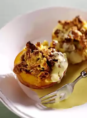manufacturer) 20-25 minutes until the crumbles are golden brown. Arrange 2 halves on 4 plates and pour the vanilla sauce over each.