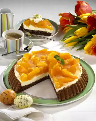 Spread evenly on the base. Chill for about 15 minutes. In the meantime, cut the peaches into slices. Measure 250 ml peach juice. Mix 25 g sugar and cake glaze powder in a pot. Gradually mix carefully with measured juice and 3 tablespoons of water with a stirring spoon. Pour peach slices onto the cream. Bring the cake glaze to the boil while stirring. Spread evenly over the peaches from the centre. Chill for about 1 hour. Serve decorated with cream, pistachios and mint