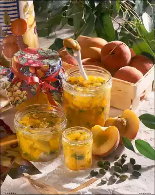 Scald peaches with hot water and peel off the skin. Stone peaches. Weigh 1400 g of flesh. Cut the flesh into small pieces. Chop pistachios roughly. Mix fruit, citric acid and jam sugar well in a large pot. Bring everything to the boil while stirring over high heat. Then let it boil thoroughly for at least 3 minutes while stirring constantly. Stir in the pistachios. Pour jam immediately into prepared twist-off jars. Close, turn upside down and let cool for 5-10 minutes