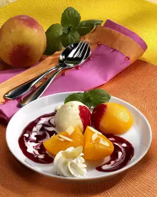 Roast almonds in a pan without fat. Leave to cool. Whip the cream until stiff. Pour into a piping bag with star-shaped spout. Arrange vanilla ice cream, peach halves and peach slices on 4 plates. Spray cream rosettes onto the plates. Sprinkle the peaches and cream with flaked almonds. Spread raspberry sauce on the plates. Decorate with mint.