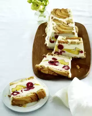 Spread half of the cream on the puff pastry. Spread raspberries and peach on top. Add the rest of the cream and smooth it down. Spread the rest of the puff pastry on top, breaking 2 pastries in half.