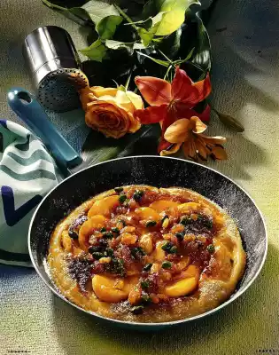 Drain the peaches. Mix dough mixture and milk to a thick dough. Heat 1 teaspoon of lard in a pan. First pour in half each of the peaches and the dough. Bake the pancakes from both sides until golden brown. Process remaining ingredients in the same way. Sprinkle with pistachios and raisins. Drizzle maple syrup over the pancakes and serve dusted with icing sugar