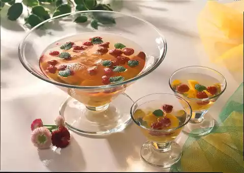 Scald peaches, rinse with cold water and peel the skin. Stone peaches, cut flesh into slices. Select the raspberries, wash carefully and drain. Put the fruits in a punch bowl and marinate in the peach liqueur for about 30 minutes.