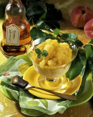 Boil the sugar and 150 ml water for about 5 minutes until the sugar is dissolved. Let it cool down. Blanch peaches in hot water, peel skin. Halve and stone the fruits and puree the pulp with the cutting stick of the hand mixer. Pour the puree into a stainless steel bowl or pot. Stir in lemon juice, sugar solution and liqueur and place the bowl in the freezer. As soon as the sorbet mass begins to set, stir vigorously with a whisk 6-8 times every 20 minutes until a creamy ice cream mass is formed. Allow to freeze for a total of 4-5 hours. Then pour into chilled glasses and serve decorated with mint leaves