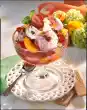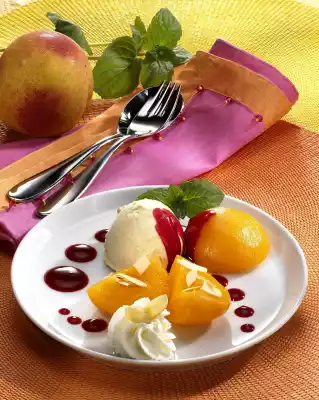 3.. Place peaches and 1 scoop of vanilla ice cream on 4 dessert plates. Spread the sauce around them. Dab the sauce with liquid cream and pull it through with a wooden skewer. Sprinkle with almond flakes, decorate with cream tuffs and mint
