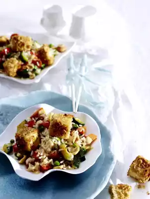 Stir the rice into the vegetables. Season to taste with lime juice, salt and pepper. Arrange everything.