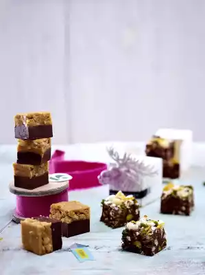 Prepare the mould. Break the chocolate into pieces for the chocolate fudge mixture. Melt with butter and half condensed milk over low heat while stirring. Smooth the mixture in the mould, chill for 10-15 minutes.