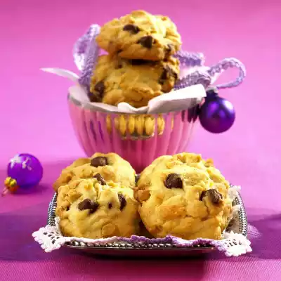 Add chocolate drops and peanuts. Using a tablespoon, place 11 piles of dough on each of 3 baking trays lined with baking paper, press flat so that cookies (each approx. 3 cm Ø) are formed. Bake the trays one after the other in a preheated oven (electric cooker: 200 °C/ convection oven: 175 °C/ gas: level 3) for 10-12 minutes. Remove from the baking tray, place on a grid and allow to cool