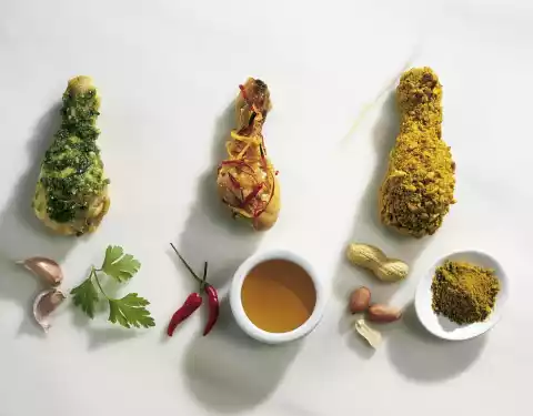 Coarsely chop the peanuts and mix with curry. Wash chicken legs and pat dry. Season with salt and pepper. Turn first in flour, then in whisked egg. Turn in peanut curry and press down firmly.