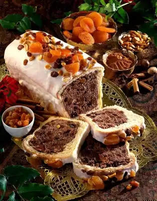 Cut the dough in half. Knead the apricots, raisins, peanuts, cocoa, cinnamon and nutmeg into one half. Cover the dough halves and let them rise in a warm place for about 30 minutes. Knead again. Form dark dough into a 26 cm long roll.