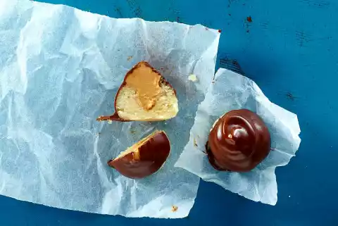 Form about 1 teaspoon of marzipan mixture into balls about the size of a cherry and press a hollow into each ball with a spoon handle. Stir peanut cream until smooth. Pour into a freezer bag, cut off a small corner. Pour into the wells.
