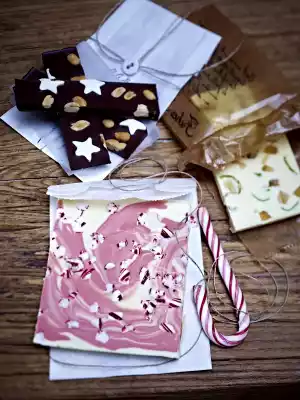 Chop the couverture and, except for 4 tablespoons, melt over a hot water bath. Remove the liquid chocolate coating from the water bath, add the remaining chocolate coating and melt while stirring. Pour the couverture into a flat mould lined with foil (approx. 15 x 20 cm). Spread stars on the couverture, press them in slightly and sprinkle with peanuts. Put in a cool place to set