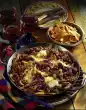 Dress dips. Coarsely chop the nuts and sprinkle on the peanut dip. Garnish pepper dip with basil