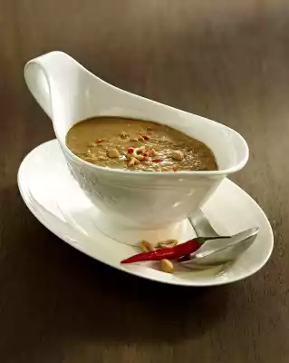 Remove lemon grass from the coconut milk. Puree the coconut milk, peanuts and chilli together in a pot, bring to the boil and simmer for 2-3 minutes. Stir in coriander seeds and cumin, simmer for another 3 minutes at low heat, season with soy sauce