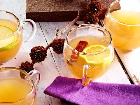 Leave to infuse for at least 10 minutes. Wash the apple and cut into slices. Add ginger ale and apple slices to the punch and warm up, fill into heat-resistant glasses. Add remaining cinnamon sticks to stir