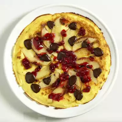 Heat 1 teaspoon of clarified butter in a pan. Put 1/4 of the pear slices in it, pour 1/4 of the batter on top and fry until golden brown. Turn the pancakes. Spread 1 tablespoon of cranberries and 25 g of chocolate chips on top. Fry the pancakes. Fry 3 more pancakes in the same way