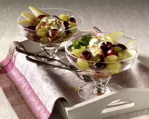 Mix lemon juice, vanillin sugar and pear syrup. Mix yoghurt and cinnamon. Roast the hazelnut flakes in a pan without fat until golden brown. Wash and drain the grapes, pluck them from the stalks and cut them in half.
