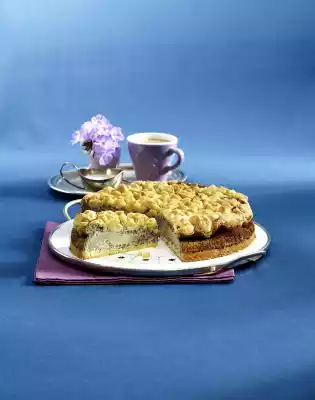 Knead into crumbles with the dough hooks of the hand mixer. Put half of the crumbles into a greased springform pan (26 cm Ø), press them to a base and chill. Separate 2 eggs for the cheese mixture. Stir cream cheese, sour cream, 75 g sugar, poppy seed filling and vanillin sugar until smooth. Stir in egg yolks and starch one after the other. Beat the egg whites with 1 pinch of salt until stiff, fold into the cheese mixture. Drain pears well. Put 1/4 of the cheese mixture on the bottom and smooth it down. Place the pear halves in the mould with the cut surface facing down. Add the rest of the cheese mixture and smooth it down.
