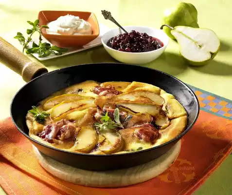Add 3 slices of breakfast bacon, 1/4 of the pear wedges and some marjoram to the pan. Spread 1/4 of the dough on top. Bake the pancakes from one side for 3-4 minutes at low heat until golden brown. Turn and bake for another 3-4 minutes.
