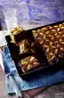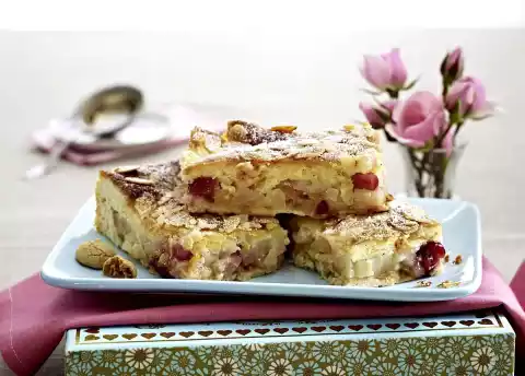 Sprinkle with almonds and 50 g sugar. Spread 100 g butter in pieces on top. Bake in a hot oven for about 35 minutes. Cover with aluminium foil after about 20 minutes. Let it cool down and dust with icing sugar.