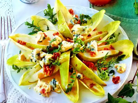 Clean and wash the chicory and rocket and drain well in a sieve. Wash and clean the pears and cut them into slices. Sprinkle with lemon juice. Coarsely chop the walnut caramel.