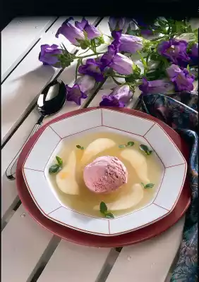Wash, peel and quarter 3 pears and cut out the core. Roughly dice the flesh. Boil up sugar, lemon peel, cinnamon, ginger, white wine and 1/2 litre water. Add the pear cubes and cook for about 10 minutes. Remove lemon peel and cinnamon from the soup. Puree fruits in the soup. Simmer the pear wedges in it for another 3 minutes. Let the soup cool down. Shortly before serving, peel the remaining pear, remove the core and cut the fruit into thin slices. Sprinkle with lemon juice. Divide the pear cold peel into 4 deep plates. Add 1 scoop of ice cream to each plate. If necessary, decorate with mint leaves and dust with cinnamon.