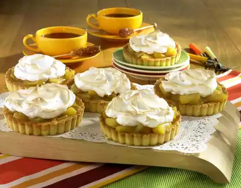 Cook in a closed pot for 4-5 minutes. Take the tartlets out of the oven. After about 15 minutes, take them out of the tin and let them cool down on a cake rack. Stir the pudding powder and apple juice until smooth and stir into the pear compote. Let the compote simmer for about 1 minute, then remove from the heat. Fill the compote into the cooled down tartlets and chill for about 1 hour. Before serving, beat the egg whites until stiff and add 60 g sugar. Spread the beaten egg whites loosely in the middle of the tartlets and bake in a preheated oven (electric range: 225 °C/ convection oven: 200 °C/ gas: level 4) for 3-5 minutes until light brown and serve immediately