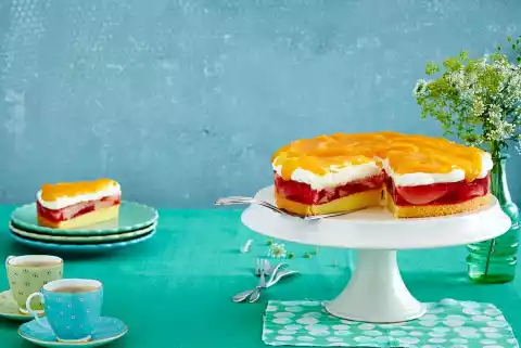 Remove the cake from the mould. Whip the cream until stiff, sprinkle with vanilla sugar and cream stiffener. Spread the cream on the pears. Mix the multivitamin juice and sauce powder and spread on the cream. Refrigerate the cake again for about 1 hour.