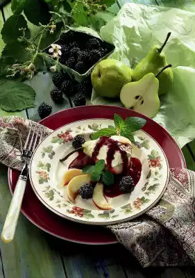Then pass through a sieve and season to taste with vanilla sugar. Cut 4 pear halves into slices. Fill the other halves with mascarpone cream. Arrange the pears on a plate and pour the blackberry sauce over them.
